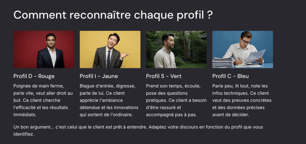 Pourquoi ? Parce que comprendre le profil de ton interlocuteur te permet d’ajuster ton discours, ton rythme, ton ton et même tes exemples… pour que le message passe, tout simplement.