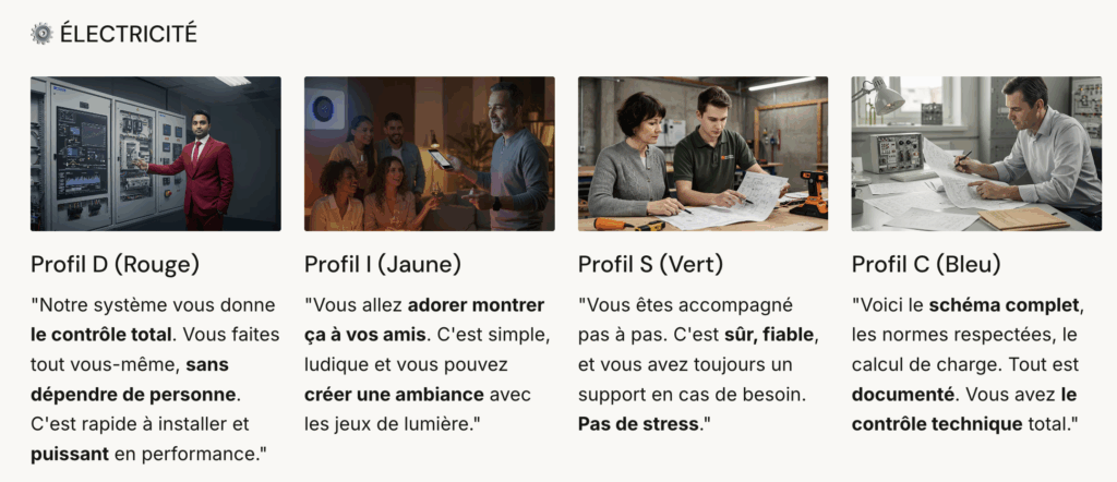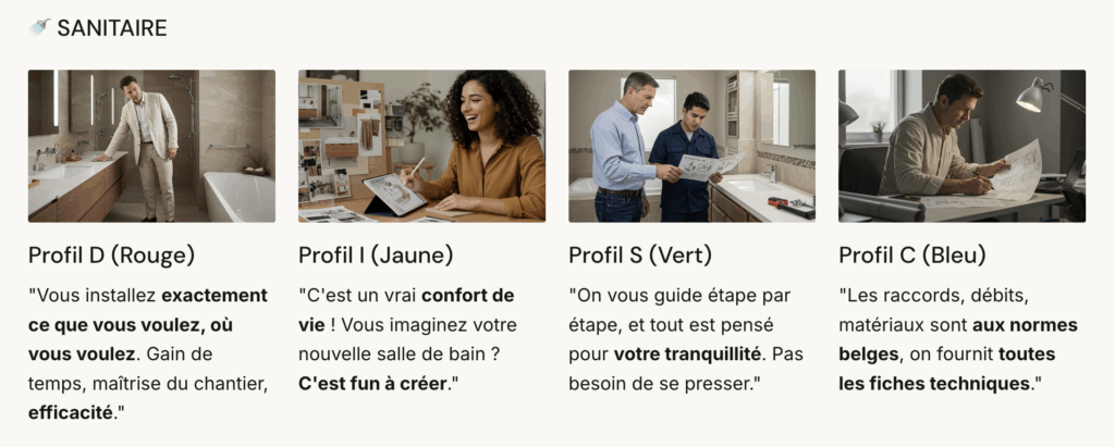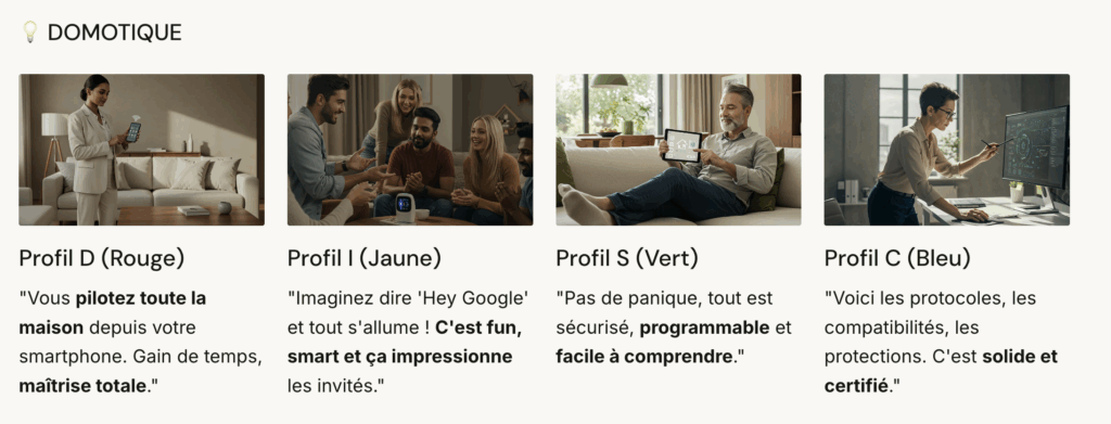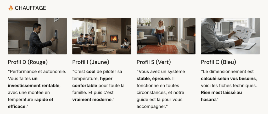 Un profil “rouge” veut aller droit au but, un “bleu” veut des chiffres, un “jaune” veut rêver, et un “vert” veut se sentir rassuré.